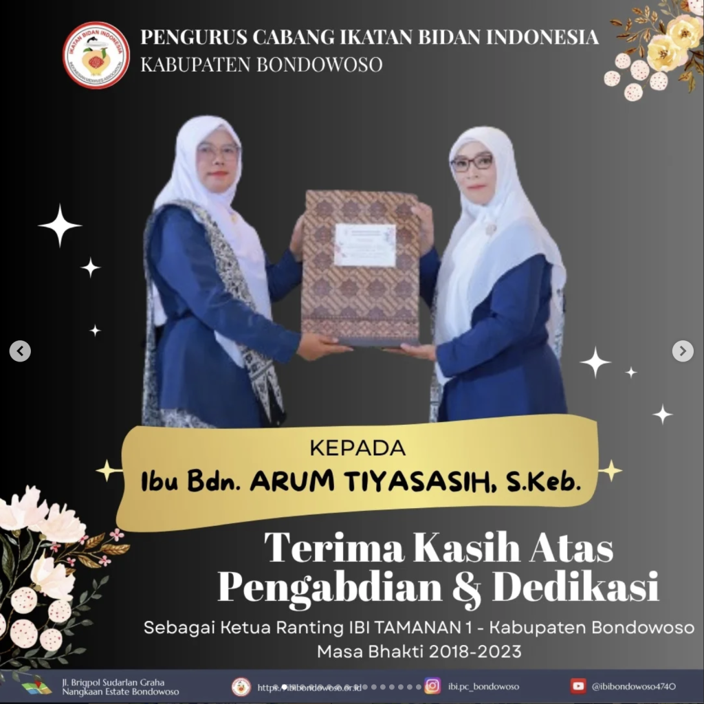 Terimakasih Kepada ibu Bdn. Arum Tiyasasih ,S.Keb. Atas Pengabdian dan Dedikasi sebagai Ketua Ranting TAMANAN 1 IBI Kabupaten Bondowoso Masa Bhakti 2028-2023