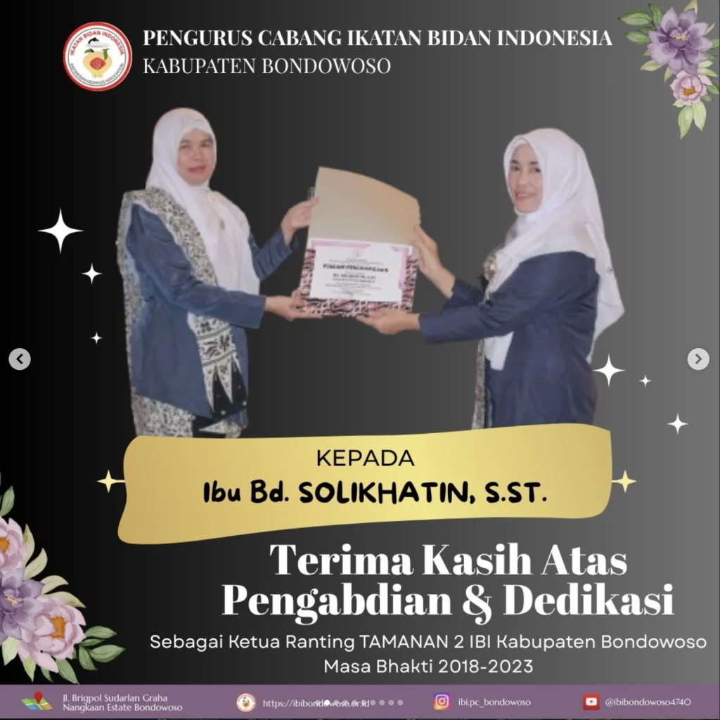 Atas Pengabdian dan Dedikasi sebagai Ketua Ranting TAMANAN 2 IBI Kabupaten Bondowoso Masa Bhakti 2018-2023