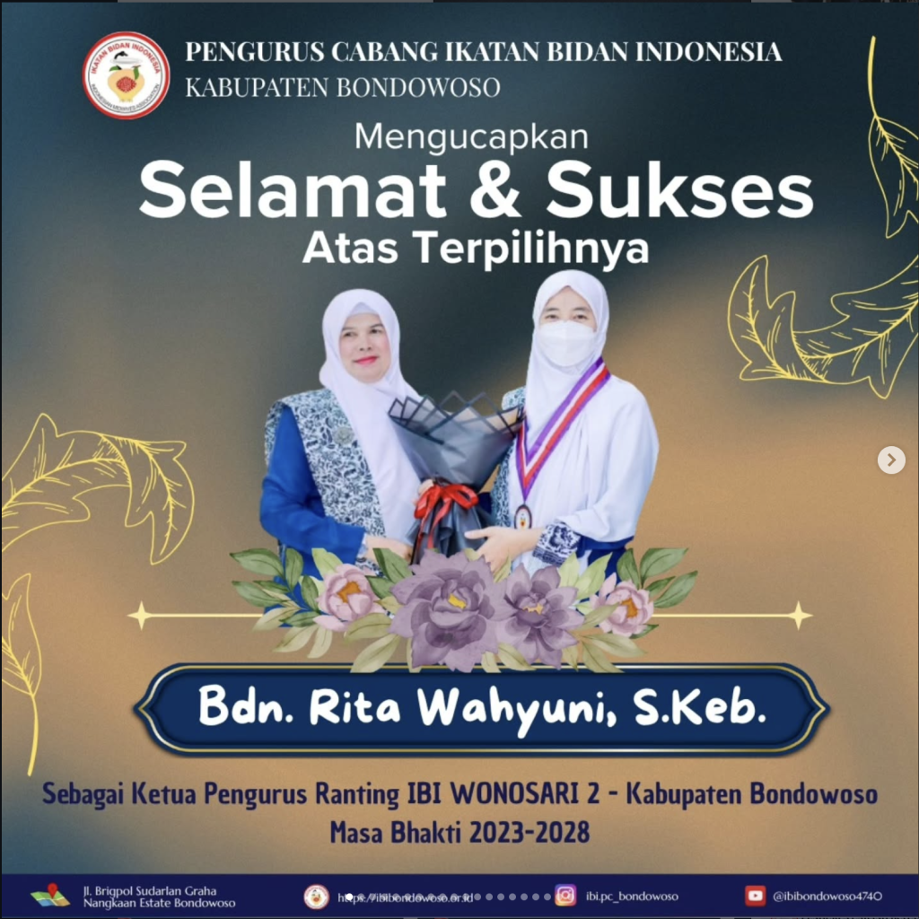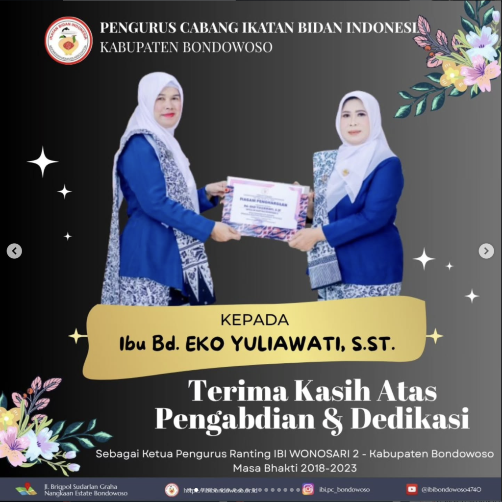 Atas Pengabdian dan Dedikasi sebagai Ketua Ranting IBI WONOSARI 2 Kabupaten Bondowoso Masa Bhakti 2028-2023